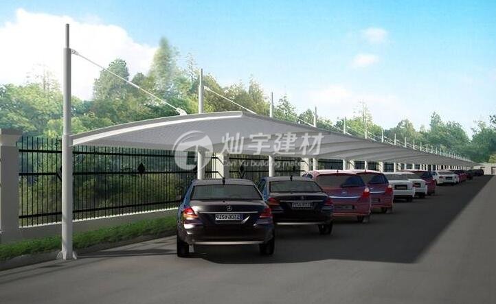 膜結構停車棚所用膜材料由基布和涂層兩部分組成。膜結構具有強度低、彈性大、易老化、徐變大、自潔性差,但價格便宜,容易加工制作,色彩豐富,抗折疊性能好等等特點。